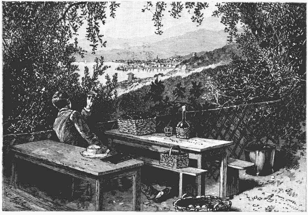 A Greek dressed in the full national costume accompanied us all the way to Missolonghi so closely that he was closer than a brother; save when we were locked in our small sleeping-cabins below (the one extra possession which a first-class ticket bestows), we were literally elbow to elbow with him. And his elbows were a weapon, like the closed umbrella held under the arm in a crowded street—that pleasant habit of persons who are not Greeks. The Greek elbow was clothed in a handsome sleeve covered with gold embroidery, for our friend was a dandy of dandies. His petticoats and his shirt were of fine linen, snowy in its whiteness; his small waist was encircled by a magnificent Syrian scarf; his cream-colored leggings were spotless; and his conspicuous garters new and brilliantly scarlet. He was an athletic young man of thirty, his good looks marred only by his over-eager eyes and his restlessness. It was his back which he presented to us, for his attention was given entirely to a party of his own friends, men and women. He talked to them; he read aloud to them from a small newspaper (they all had newspapers, and read them often); he stood up and argued; he grew excited and harangued; then he sat down, his inflated skirts puffing out over his chair, and went on with his argument, if argument it was, until, worn out by the hours of his eloquence, some of his companions fell asleep where they sat. His meals were astonishingly small. As everything went on under our eyes, we saw what they all ate, and it was unmistakable testimony to the Greek frugality. Our companion had brought with him from Corfu, by way of provisions for several days, a loaf of bread about as large as three muffins in one, a vial containing capers, a grapeleaf folded into a cornucopia and filled with olives, and a pint bottle of the light wine of the country. The only addition which he made to this store was a salted fish about four inches long, which he purchased daily from the steward. There was always a discussion before he went in search of this morsel, which represented, I suppose, the roast meat of his dinner, and when he returned after a long absence, bearing it triumphantly on the palm of his hand, it was passed from one to the next, turned over, inspected, and measured by each member of the group, amid the most animated, eager discussion. When comment was at last exhausted, the superb orator seated himself (always with his chair against our knees), and placed before him, on a newspaper spread over the bench, his precious fishlette divided into small slices, with a few capers and olives arranged in as many wee heaps as there were portions of fish, so that all should come out even. Then, with the diminutive loaf of bread by his side and the bottle of wine at his feet, he began his repast, using the point of his pocketknife as a fork, eating slowly and meditatively, and intently watched by all his friends, who sat in silence, following with their eyes each mouthful on its way from the newspaper to his lips. They had previously made their own repasts in the same meagre fashion, but perhaps they derived some small additional nourishment from watching the mastication of their friend. When his fish had disappeared, accompanied by one slender little slice of bread, our neighbor lifted the wine-bottle, and gave himself a swallow of wine; then, after a pause of a minute or two, another. This was all. The bottle was recorked, and with the remaining provisions put carefully away. All foreign residents in Greece, whether they like the people or dislike them, agree in pronouncing them extraordinarily abstemious. Drunkenness hardly exists among them.