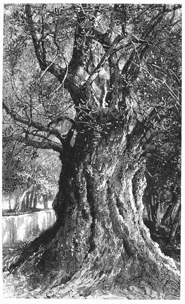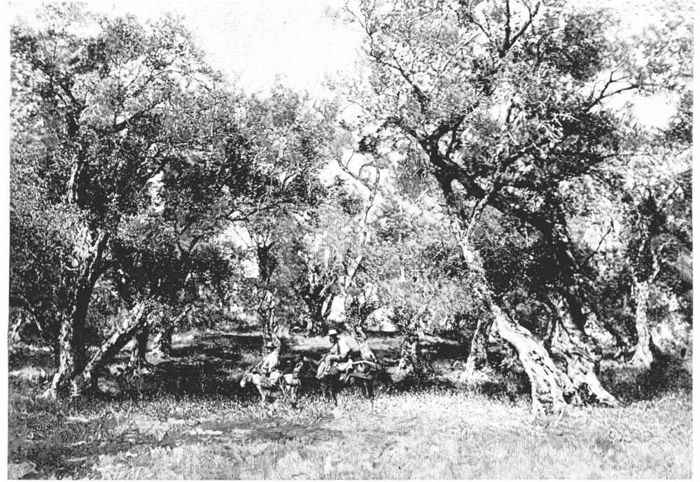 Seated, then, in a berlin, or perhaps in a calash, one goes out at least to visit the olive groves, if not to cross the island. These groves are not the ranks of severely pruned, almost maimed, trees which greet the traveller in parts of southern Europe—groves without shade, without luxuriance; viewed from a distance, their gray-green foliage forms a characteristic part of the landscape, but at close quarters they have but one expression—namely, how many coins are to be squeezed out of each poor tree, whose every bud appears to have been counted. At Corfu one strolls through miles of wood whose foliage is magnificent; it is possible to lounge in the shade, for there is shade, and to draw a free breath. No doubt the Corfiotes keep guard over their leafy domain; but the occasional visitor, at least, is not harassed by warnings to trespassers set up everywhere, by children following him with suspicious eyes, by patrols, dogs, stone walls, and sometimes by stones of another kind which do not stay in the walls, but come flying through the air to teach him to keep his distance. It is difficult, probably, for people from the New World to look upon a forest as something sacred, guarded, private; we have taken our pleasure "in the woods" all our lives whenever we have felt so inclined; we do not intend to do any harm there, but we do wish to be free. In the olive groves of Corfu the wish can be gratified. Their aisles are wonderful in every respect: in the size of the trees (some of them are sixty feet high), in the picturesque shapes of the gnarled trunks, in the extent of the long vistas where the light has the color which some of us know at home—that silvery green under the great live-oaks at the South, when their branches are veiled in the long moss.