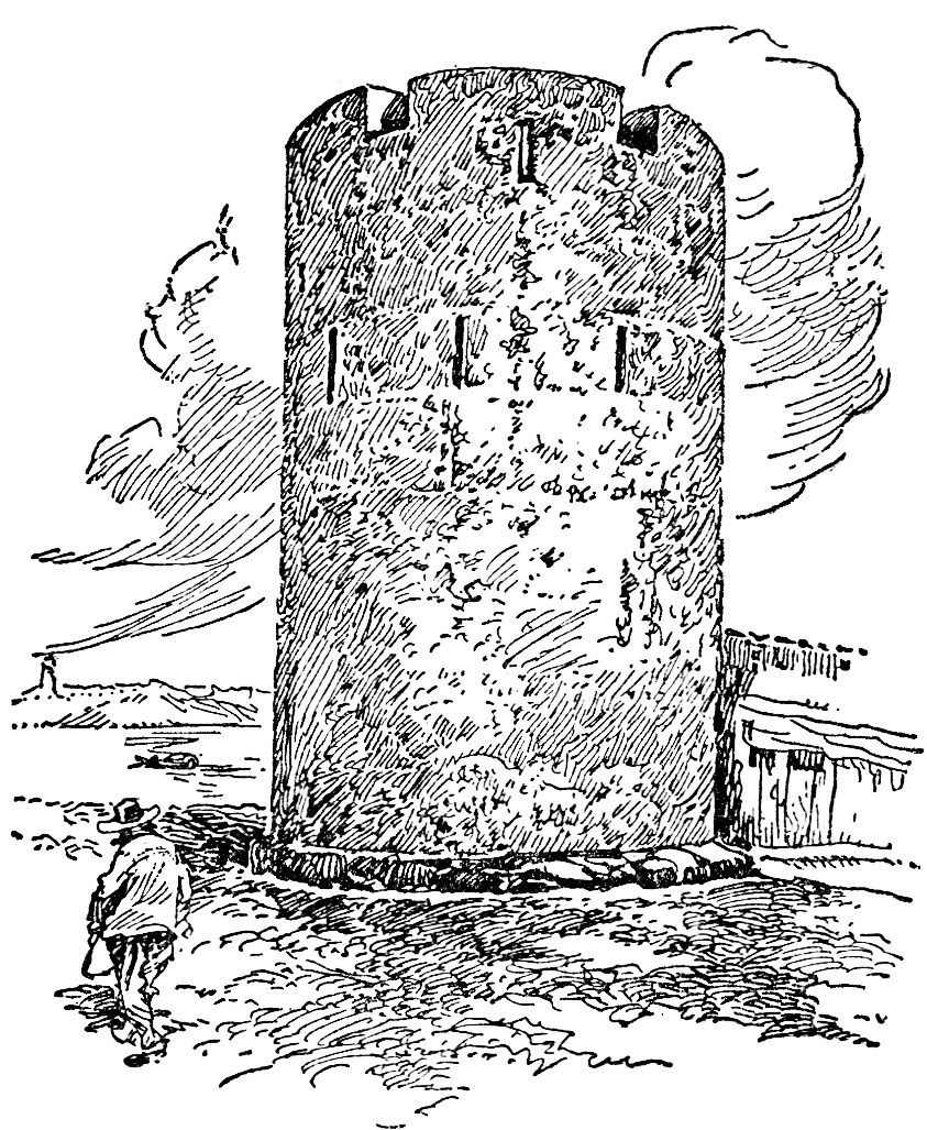 "Under this tower there lieth a sandy shore, where men may easily go aland; and by the tower there runneth a hill along by the water's side, which easily with small store of ordnance, subdueth the town and port. The port within is so large that there{350} may easily ride a thousand sail of ships, without anchor or cable; for no wind is able to hurt them.