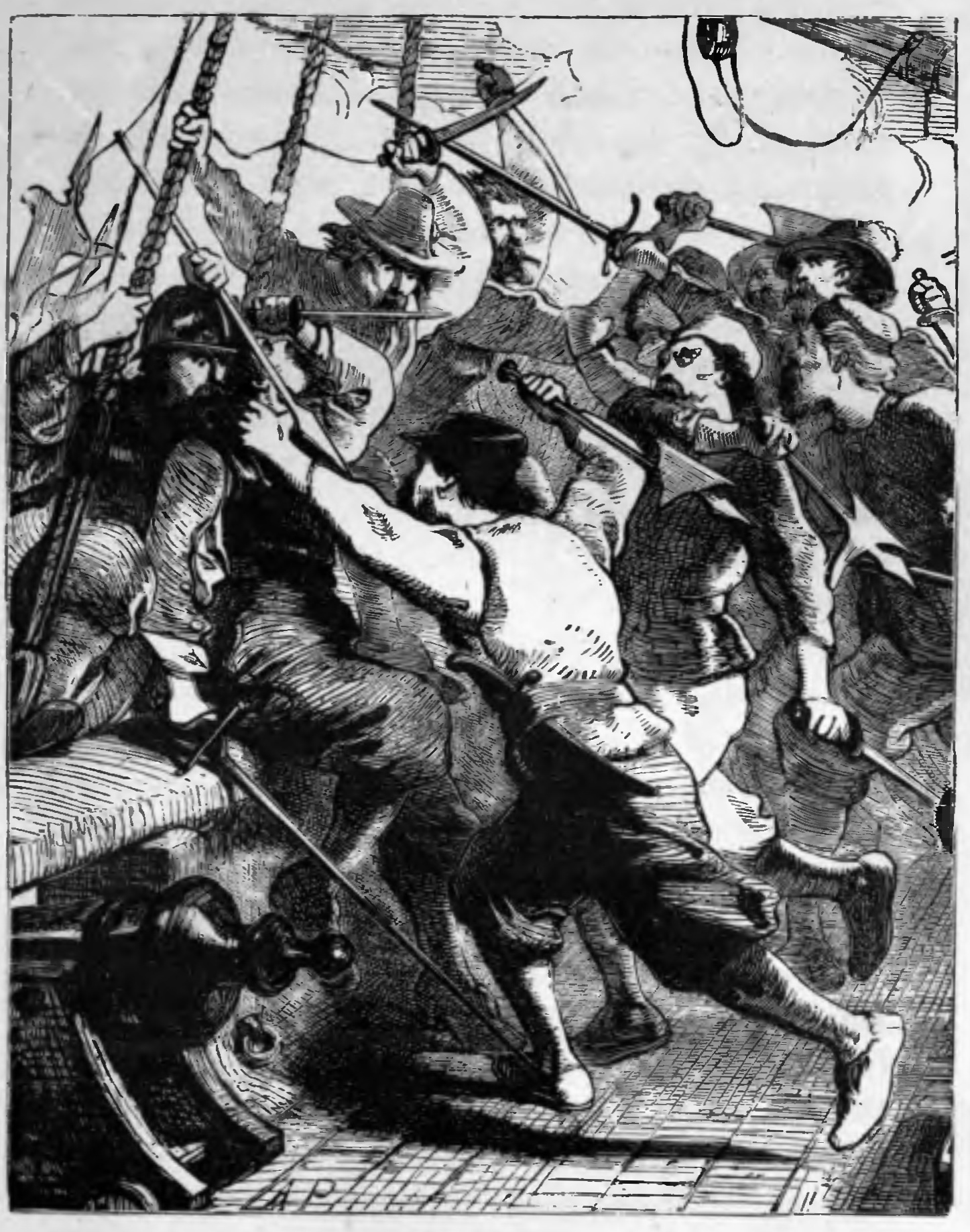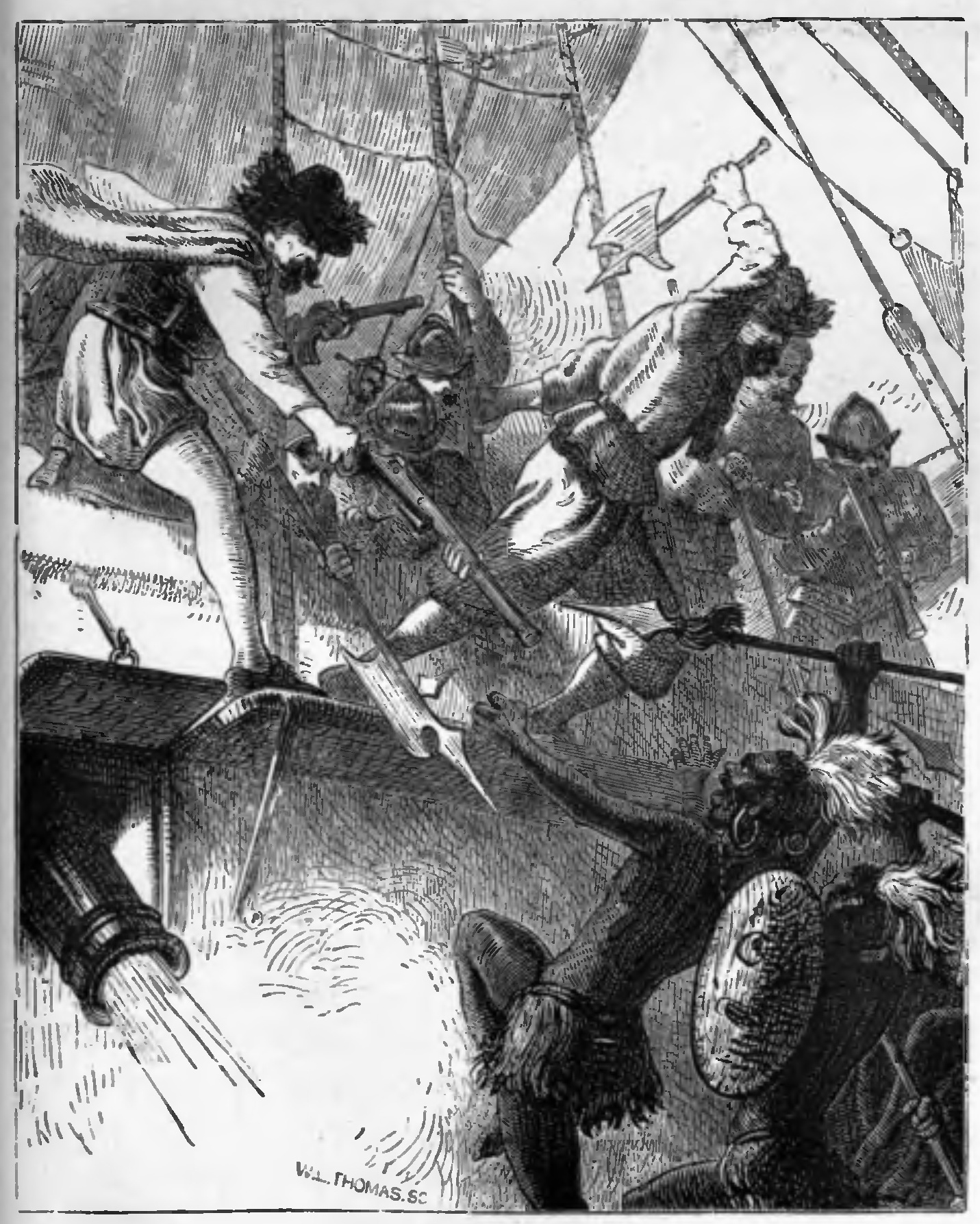 “At the same moment a drum beats in the big boat, and the Spaniards, soldiers in disguise, begin to climb up the sides. I run aft and clap the hatch over the cabin, so as to keep the five gentlemen there quiet, while our men, drawing out their weapons, begin to lay about them with a will which astonishes the dons. Some run to the guns and point them down at the boats; others, with axes, force back the men who are climbing the sides. Our decks are slippery with blood. Several of our men are wounded. A shot strikes a shipmate standing in front of me, and, falling dead, he knocks me over. It saves my life, for a Spaniard is making a cut at me, which misses, and our captain cuts him down. Still we fight on against fearful odds. Our enemies gain the deck, but it is only to add to the heap of the slain. At last the corregidor cries out, and begs our captain to order his men to cease fighting.