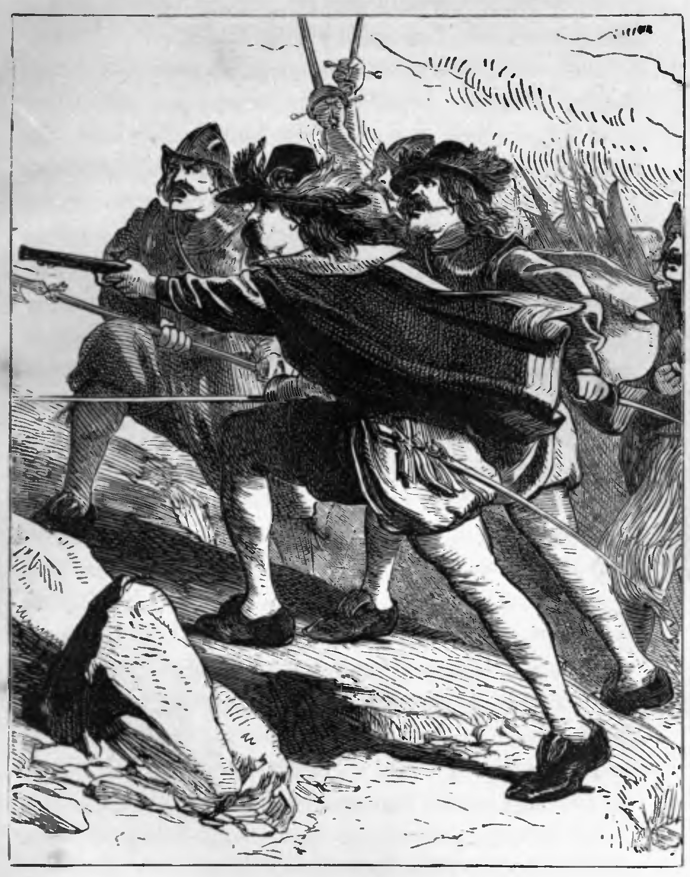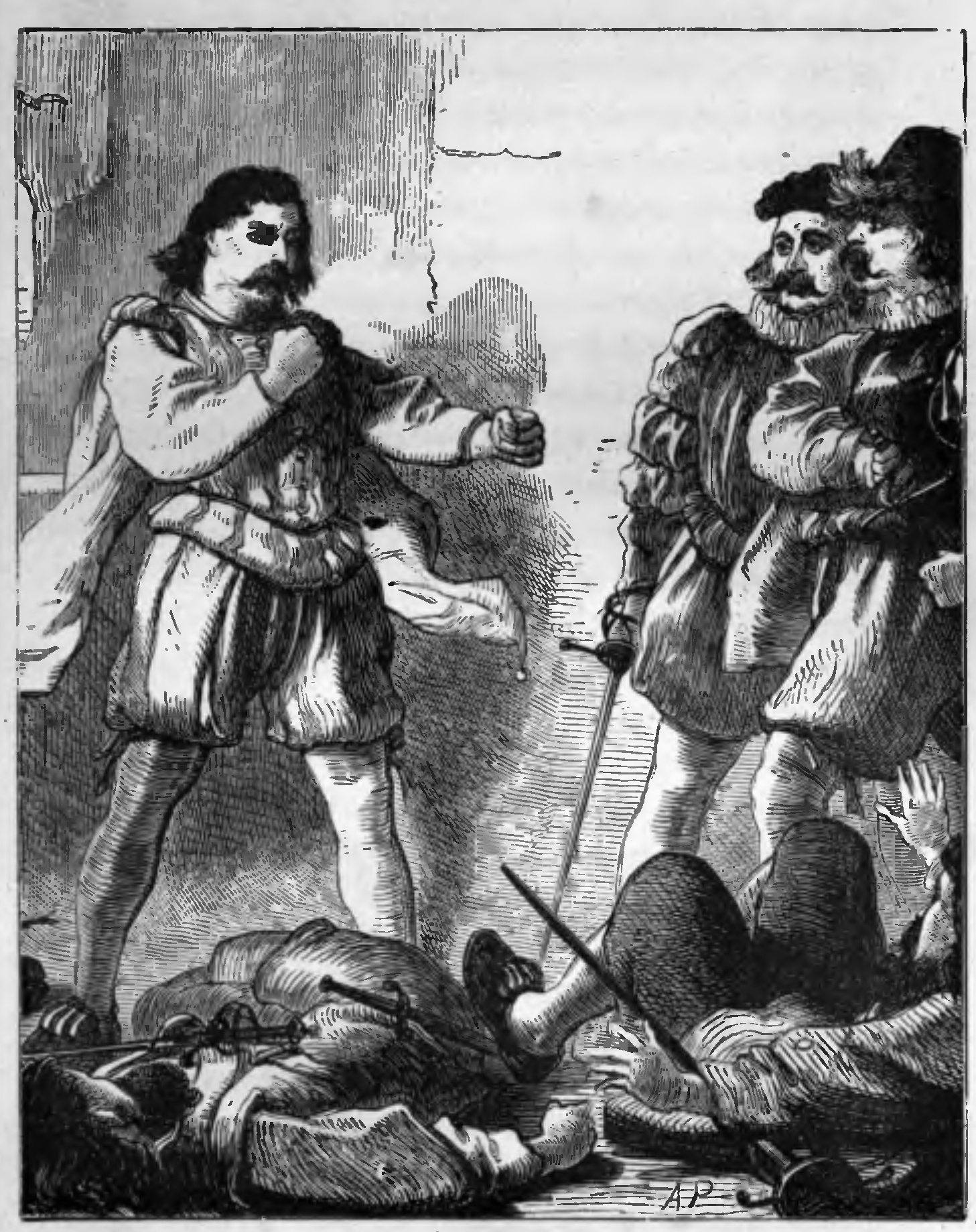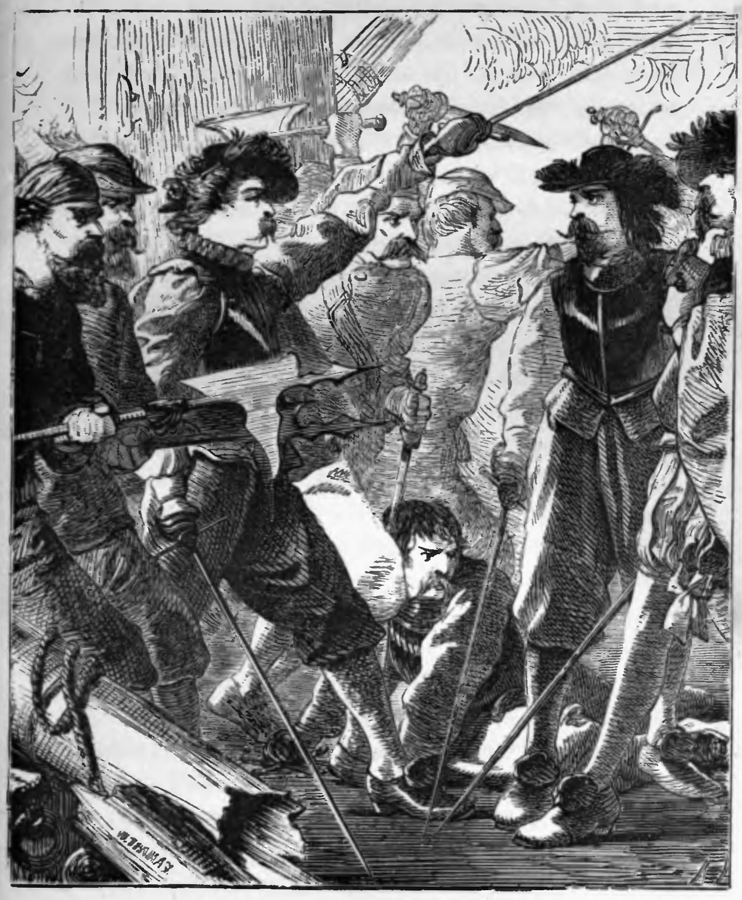 The young gentleman, hearing his name called, stopped and looked earnestly at the person who had addressed him, and who was following rapidly in his footsteps. The costume of his pursuer was far more gay and dashing than was his, being composed of bright-coloured velvet and silks, with a golden chain round his neck, a plumed hat set jauntily on his head, and a jewel-hilted sword by his side. He had a laughing blue eye and light curling locks, and though his countenance was well bronzed, and his voice strong and manly, his features still bore the impress of early youth. Indeed, his hairless lip and beardless chin showed that he had scarcely emerged from boyhood. He ran up to the person of whom he was in pursuit, and frankly held out his hand.