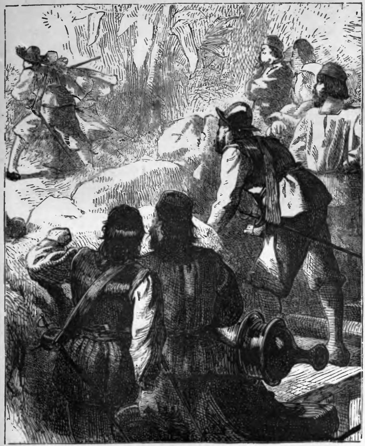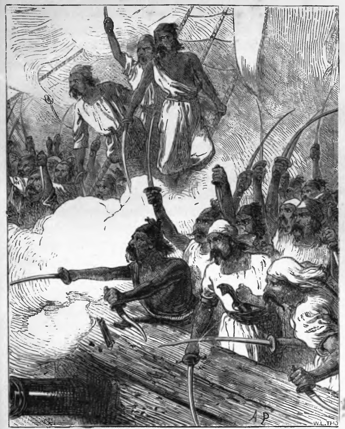 “Leaving them in the cabin, I went on deck, where I found that the captain had served out arms to all the men, and loaded the guns ready for action. Some of our people were sent below, others lounged about the deck with their weapons concealed under their clothes. He had good reason for this precaution, for as I looked over the side I saw two boats pulling off towards us, one containing twenty or thirty men, the other near a hundred, it seemed.