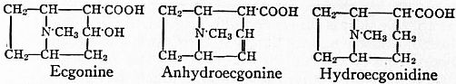 ECGONINE, in chemistry, C9H15NO3, a cycloheptane derivative with a nitrogen bridge. It is obtained by hydrolysing cocaine with acids or alkalis, and crystallizes with one molecule of water, the crystals melting at 198° to 199° C. It is laevo-rotatory, and on warming with alkalis gives iso-ecgonine, which is dextro-rotatory. It is a tertiary base, and has also the properties of an acid and an alcohol. When boiled with caustic baryta it gives methylamine. It is the carboxylic acid corresponding to tropine, for it yields the same products on oxidation, and by treatment with phosphorus pentachloride is converted into anhydroecgonine, C9H13NO2, which, when heated to 280° C. with hydrochloric acid, splits out carbon dioxide and yields tropidine, C8H13N. Anhydroecgonine melts at 235° C., and has an acid and a basic character. It is an unsaturated compound, and on oxidation with potassium permanganate gives succinic acid. It is apparently a tropidine monocarboxylic acid, for on exhaustive methylation it yields cycloheptatriene-1·3·5-carboxylic acid-7. Sodium in amyl alcohol solution reduces it to hydroecgonidine C9H15NO2, while moderate oxidation by potassium permanganate converts it into norecgonine. The presence of the heptamethylene ring in these compounds is shown by the production of suberone by the exhaustive methylation, &c., of hydroecgonidine ethyl ester (see Polymethylenes and Tropine). The above compounds may be represented as: