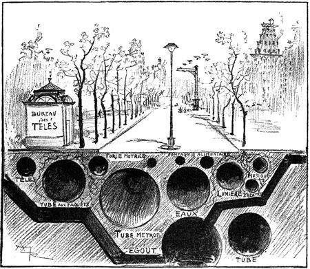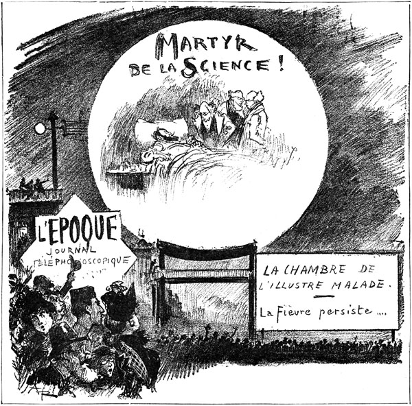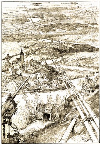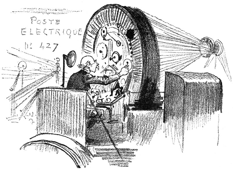Le danger avait disparu, mais non les dernières traces de la grande perturbation. Sur la plaque du téléphonoscope de Georges Lorris, comme sur tous les Télés de la région, passèrent avec une fabuleuse vitesse des milliers d'images confuses et des sons apportés de partout remplirent les maisons de rumeurs semblables au rugissement d'une nouvelle et plus farouche tempête. Il est facile de se figurer cette assourdissante rumeur, ce sont les bruits de la vie sur une surface de 1,600 lieues carrées, les bruits recueillis partout par l'ensemble des appareils, condensés en un bruit général, reportés et rendus en bloc par chacun de ces appareils avec une intensité effroyable!