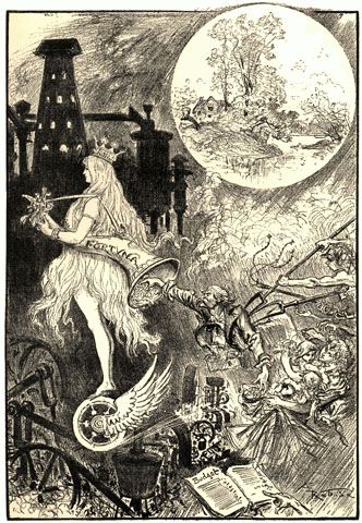 Elle est l'inépuisable foyer, elle est la lumière et la force; sa puissance captive est employée à faire marcher aussi bien l'énorme accumulation de machines colosses de nos millions d'usines, que les plus délicats et subtils mécanismes. Elle porte instantanément la voix d'un bout du monde à l'autre, elle supprime les limites de la vision, elle véhicule dans l'atmosphère l'homme, son maître, la lourde créature, jadis ridiculement attachée au sol comme un insecte incomplet.