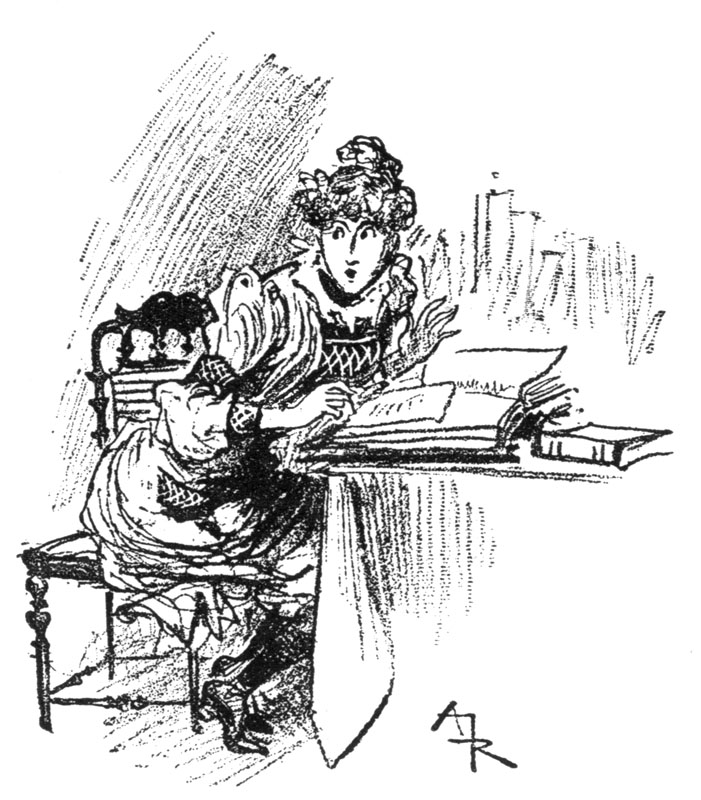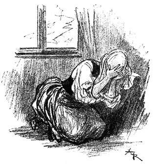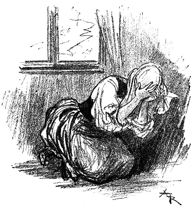 C'était une chambre au mobilier très simple, une petite chambre aux boiseries claires, meublée seulement de quelques chaises et d'une table chargée de livres et de cahiers, avec une corbeille à ouvrage devant la cheminée. Réfugiée dans un angle, presque agenouillée, une jeune fille semblait encore en proie à la plus profonde terreur. Elle avait les mains sur les yeux et ne les retirait que pour les porter sur ses oreilles dans un geste d'affolement.