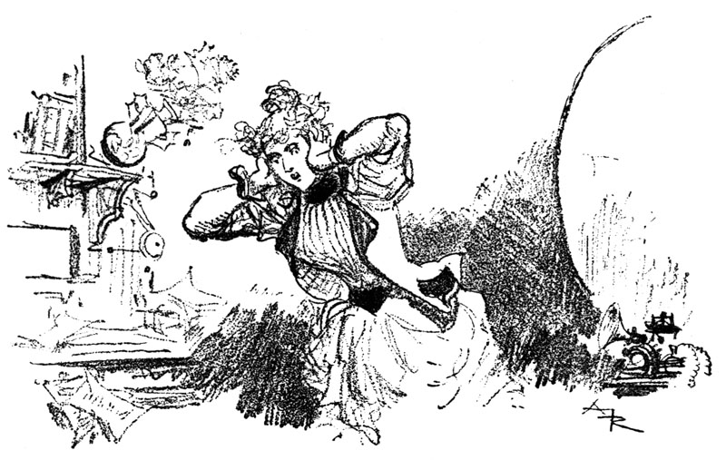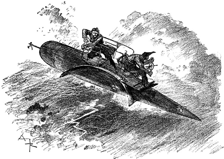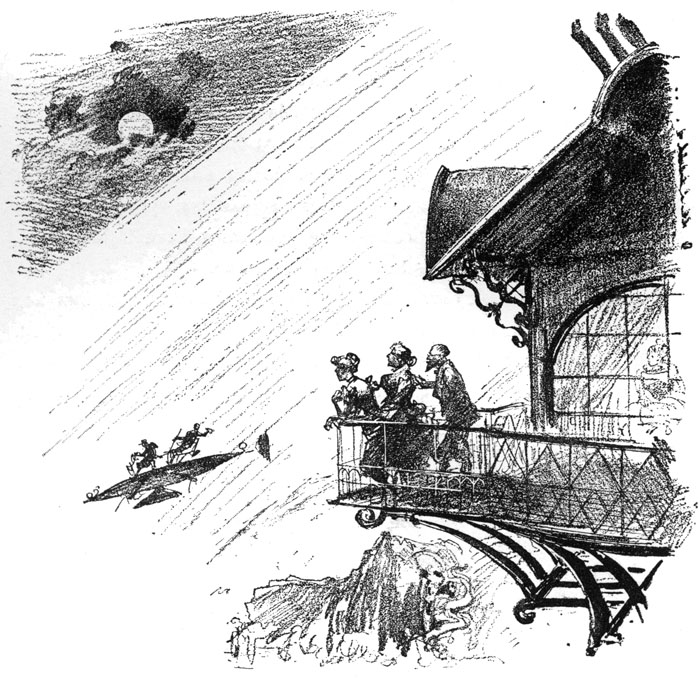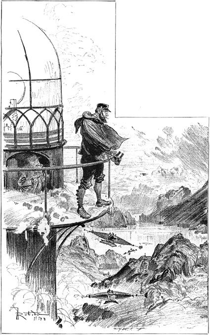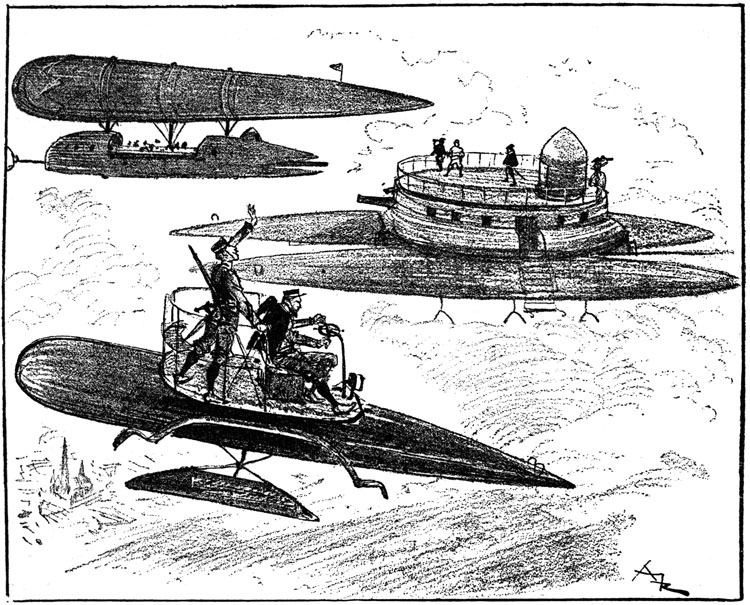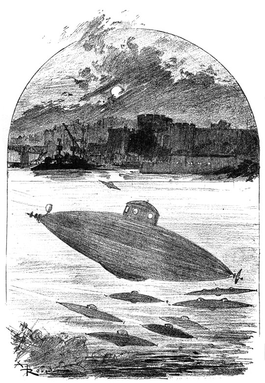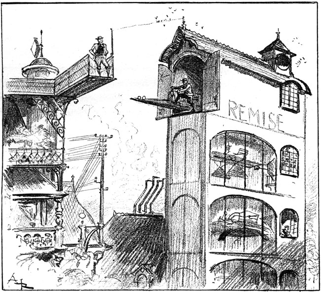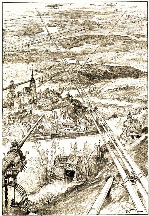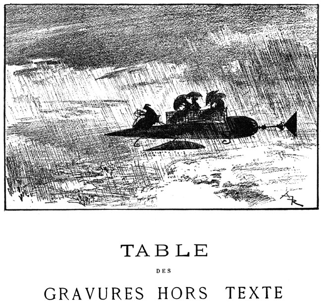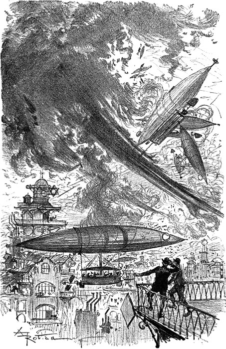Quand on vit le danger, il y eut dans la foule des aéronefs une bousculade fantastique pour chercher un abri à terre. Le millier de véhicules s'abattit à toute vitesse en une masse confuse et enchevêtrée où les accidents d'abordage furent nombreux et souvent graves. La tournade, arrivant en foudre, balaya tout ce qui n'eut pas le temps de fuir; il y eut des aéronefs désemparées, emportées dans le tourbillon et précipitées en quelques secondes à cinquante lieues de là; par bonheur, dans ce désastre, les grandes aéronefs portant les membres de l'Aéronautic-Club et leurs familles étaient pourvues du nouvel appareil réunissant l'électromètre et les tubes de gaz isolateur à une soupape automatique; l'appareil s'ouvrit de lui-même dès que l'aiguille marqua danger et les aéronefs, enveloppées dans un nuage protecteur, fortement secouées seulement, purent regagner l'embarcadère du club.
