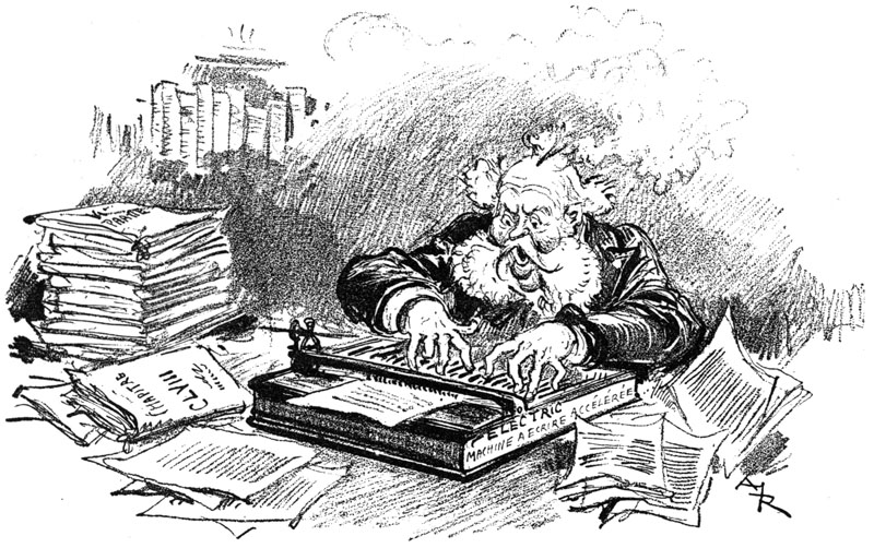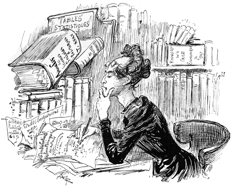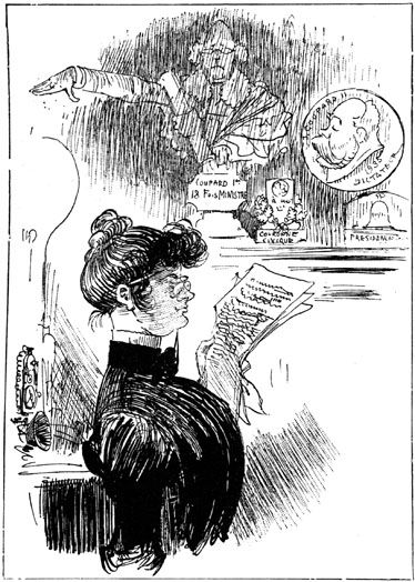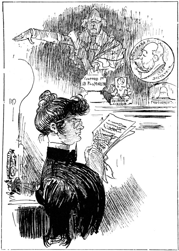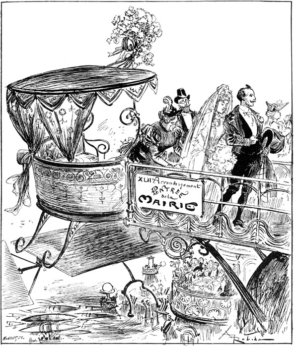 La cérémonie a été imposante. Comme M. Philox Lorris se préparait à voler, en soupirant, un quart d'heure à ses occupations pour aller donner la signature indispensable, à la mairie, une avouée se présenta, en même temps qu'une grêle de papiers timbrés et de phonogrammes d'avoués, d'huissiers et autres officiers ministériels s'abattait sur lui. C'étaient Mlles la doctoresse Sophie Bardoz et la sénatrice Hubertine Coupard, de la Sarthe, qui entamaient chacune un procès en rupture de négociations matrimoniales, demande en mariage impliquant promesse, et demandaient chacune 6 millions de dommages-intérêts.