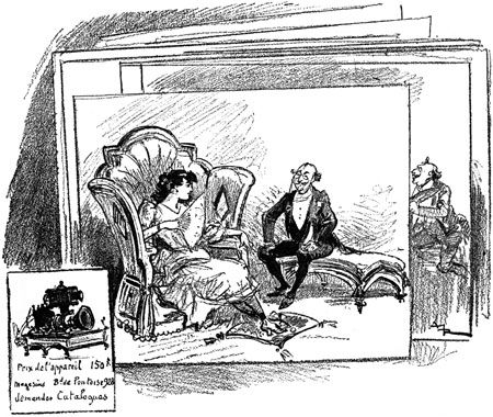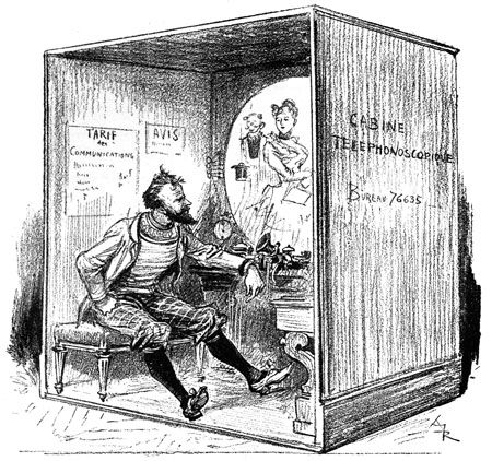 Celui-ci n'est pas là de sa personne, il est bien loin, à trois cents lieues, dans la maison de l'ingénieur chef de ses Mines de vanadium des montagnes de la Catalogne, mais il apparaît dans la plaque de cristal du téléphonoscope, cette admirable invention, amélioration capitale du simple téléphonographe, portée récemment au dernier degré de perfection par Philoxène Lorris lui-même.