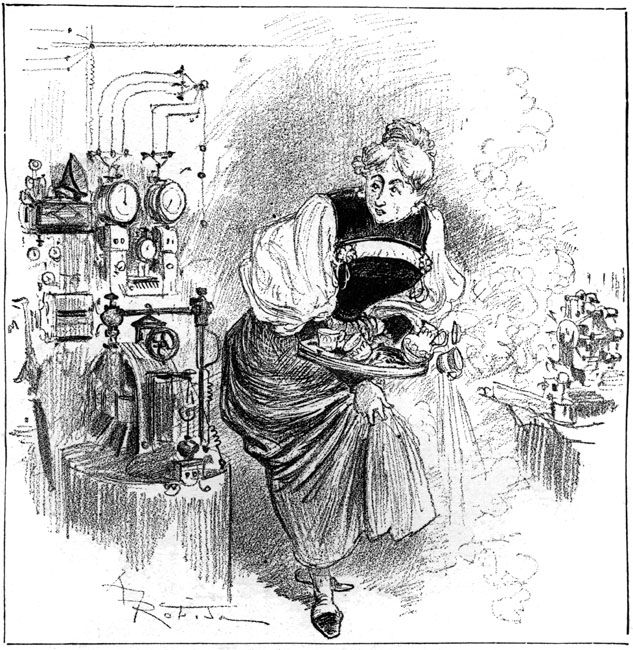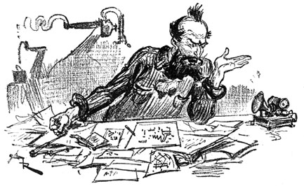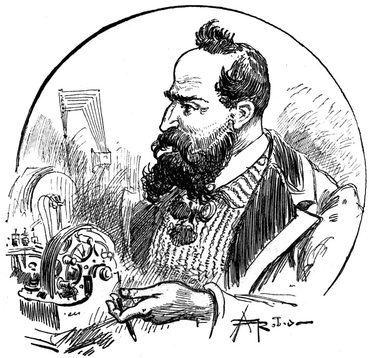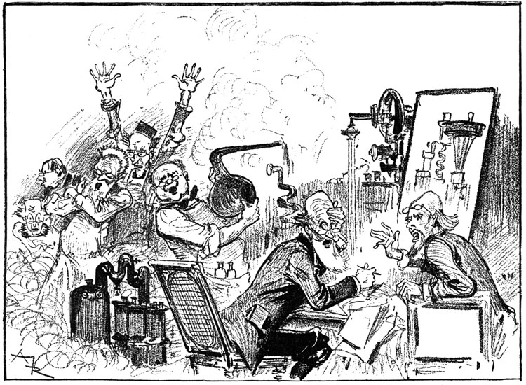 «Écervelé! lui cria-t-il, tu n'as pas tes semelles isolatrices et tu évolues comme cela dans une maison où l'électricité court partout dans un réseau de fils entre-croisés et circule comme le sang dans les veines d'un homme!... Mets-les donc et fais attention. C'est une fuite qui vient de se produire quelque part, et l'on ne sait pas jusqu'où peuvent aller les accidents... Allons, je n'ai pas le temps, je te laisse; d'ailleurs, voilà nos communications embrouillées...»