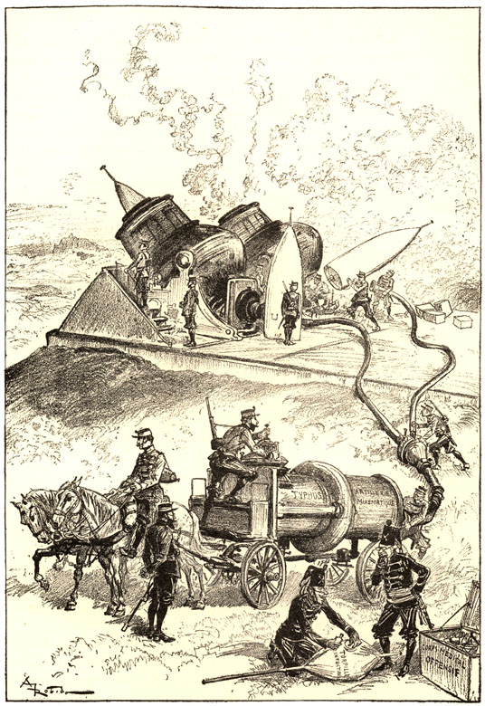 La tournade était dans son plein; les accidents causés par la terrible puissance du courant fou, par ces effroyables forces naturelles emmagasinées, concentrées et mesurées par l'homme, échappées soudain à sa main directrice, libres maintenant de tout frein, se multipliaient sur une région représentant à peu près le cinquième de l'Europe. Depuis une heure, toutes les communications électriques se trouvant coupées, on peut juger de la perturbation apportée à la marche du monde et aux affaires. La circulation aérienne était également interrompue, le ciel s'était vidé presque instantanément de tout véhicule aérien, l'ouragan avait le champ libre pour dérouler dans l'atmosphère ses spirales dangereuses. Mais, bien qu'au premier signal de leurs électromètres toutes les aéronefs se fussent garées au plus vite, quelques sinistres s'étaient produits. Plusieurs aérocabs rencontrés par la trombe au moment où elle fusait du réservoir furent littéralement pulvérisés au-dessus de Lyon; il n'en tomba point miette sur le sol et des aéronefs surprises çà et là sans avoir eu le temps de s'envelopper d'un nuage de gaz isolateur, dont le rôle est analogue à celui de l'huile dans les tempêtes maritimes, s'abattirent désemparées avec leur personnel tué ou blessé.