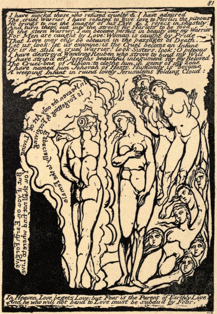 (This I take to be the jealous lust of power and exclusive love speaking through the incarnate “female will.” See Jerusalem again.)