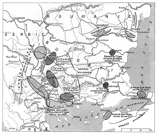Alliés sans être amis, ils gardaient ensemble, se surveillant l'un l'autre, le port de Salonique: mais cette coopération avait trop duré et, le 30 juin, les Bulgares étaient aux prises à Salonique avec les Grecs, en même temps qu'avec les Serbes dans la vallée du Vardar.Voir l'article, page 7.