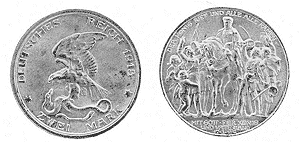 La légende du revers explique la scène qui s'y trouve représentée: Der Kônig rief und alle, alle kamen--le roi appela et tous, tous accoururent. Légende qui semble bien n'être à tous égards qu'une légende, même historique, puisque Gerhardt Hauptmann, dans sa pièce précisément, a une fois de plus montré que c'était le peuple, «alle, alle» qui appela Frédéric Guillaume III, en 1813, fidèle allié encore de Napoléon Ier.
