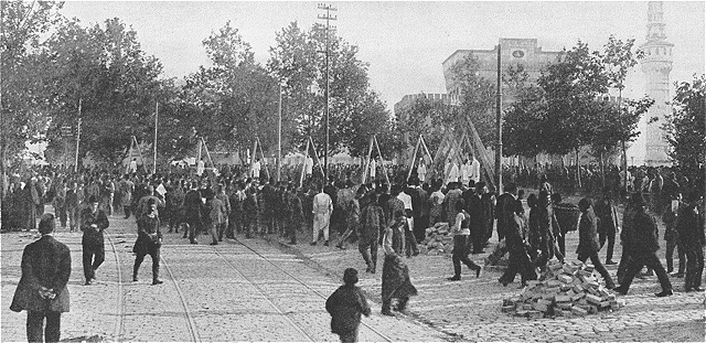 foule des curieux entoure les potences, sur la place Bayazid.--Phot.