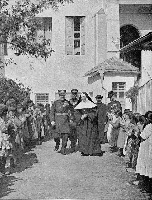Puis l'amiral Nicol, toujours accompagné du consul de France, et guidé par le E. P. Chanteur, rendit tour à tour visite au pensionnat des religieuses de Saint-Joseph de Lyon et à l'hôpital français dirigé par des soeurs du même ordre. Les représentants de la France retrouvèrent, ici et là, la même réception chaleureuse.