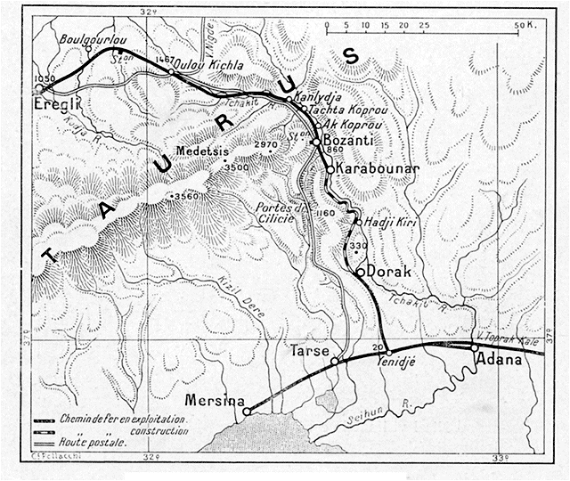 Les négociations depuis quelque temps engagées entre la France et la Turquie d'abord, puis entre l'Allemagne et la Turquie et à propos desquelles Djavid bey, ministre des Finances du cabinet Saïd-Halim, séjourne à Berlin, en attendant de venir à Paris, ont appelé à nouveau l'attention générale sur la grosse question des concessions de chemins de fer en Asie Mineure, et en particulier sur la plus importante d'entre elles: le «Bagdad». Peut-être n'est-il pas inutile de saisir cette occasion de préciser exactement l'état actuel des travaux.