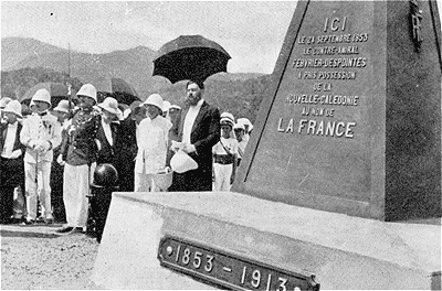 Le 24 septembre 1853, le contre-amiral Febvrier-Despointes, commandant en chef de nos forces navales en Océanie, ayant son pavillon sur le Phoque, prenait possession, au nom de la France, de la Nouvelle-Calédonie: l'anniversaire de cette annexion a été célébré, il y a deux mois, à Balade, par l'inauguration d'un monument commémoratif,--une simple pierre portant une inscription et deux dates: 1853-1913.