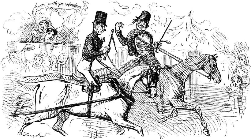 No doubt the work he undertook for Bell’s Life in London, a long-established and long-discontinued paper, in which sport of all kinds was the most prominent feature—and which occupied much of Leech’s time in his youthful days—contributed to the creation of a taste and love for field sports that always distinguished him. Quite a band of comic artists, including Cruikshank, Kenny Meadows, “Phiz,” Seymour, and Leech, contributed sketches illustrative of a variety of subjects by a variety of authors; Leech’s work being easily distinguishable from that of his brethren of the pencil.
