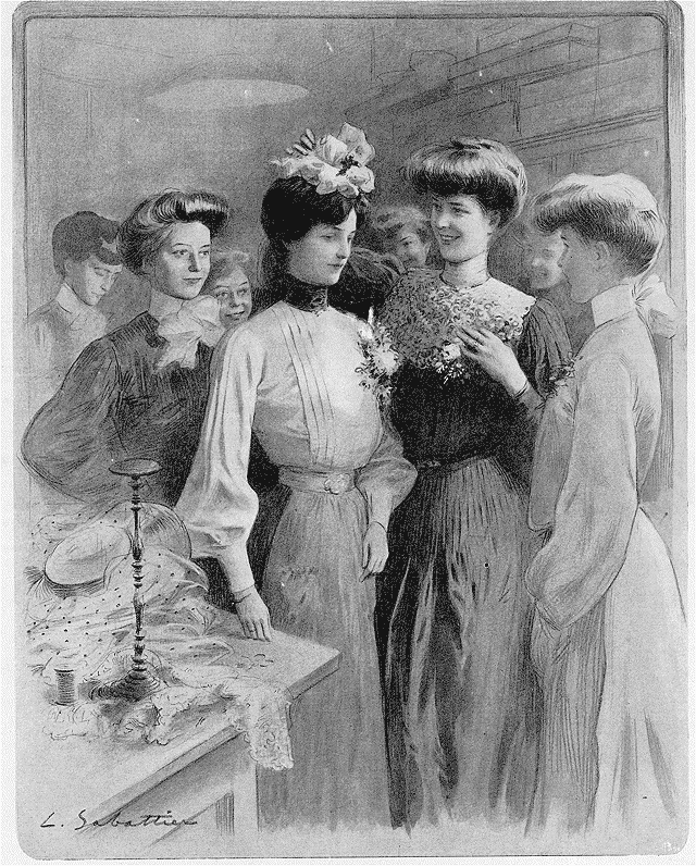 | L'éventaire de la fleuriste assailli par les «midinettes». | Une «Catherine» promenant son bonnet, avec ses camarades. |