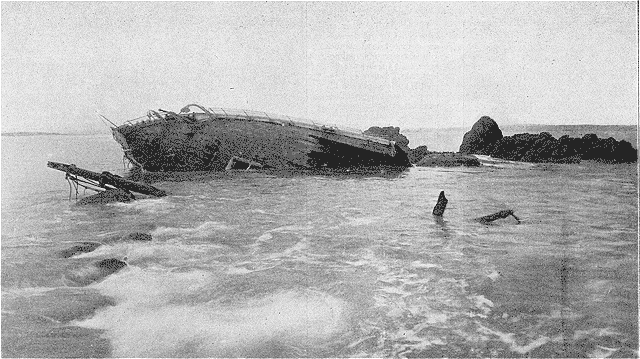 Tout à coup un choc formidable se produisit, a raconté un survivant du naufrage, le matelot Grinter. Le commandant Gregory, parfaitement calme, donna l'ordre de mettre les embarcations à la mer. L'opération ne put être faite que pour deux d'entre elles, qui elles-mêmes chavirèrent bientôt. Le navire coulait rapidement.
