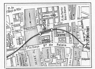 trajet du Métropolitain sous les deux bras de la Seine et à travers la