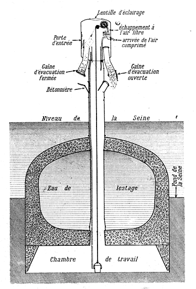 Rappelons d'abord la structure et les dimensions du caisson. Il est formé d'un cuvelage voûté en fonte, mesurant environ 35 mètres de longueur sur 7 mètres de largeur et 5 mètres de hauteur, protégé par une cuirasse variant de 70 centimètres à un mètre d'épaisseur, faite d'une armature métallique noyée dans le béton. Cette cuirasse se prolonge jusqu'à 1m,80 au-dessous du cuvelage ménageant ainsi entre le plafond et le sous-sol de la Seine une «chambre de travail» à l'intérieur de laquelle les ouvriers creusent le lit du fleuve pour y «foncer» peu à peu le caisson.