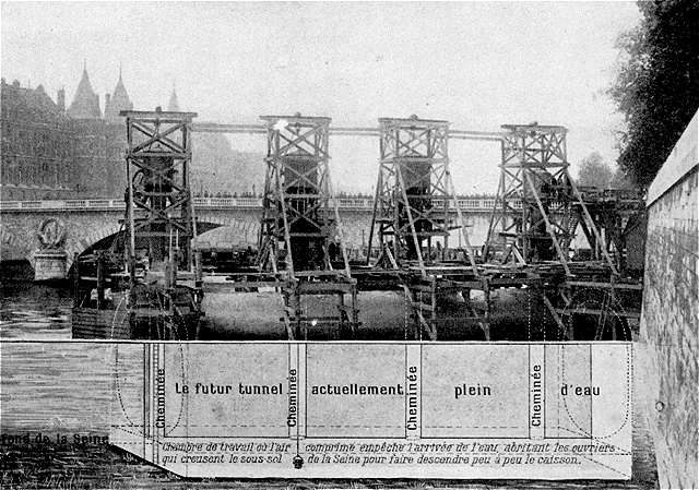 Au mois de septembre dernier, on remorquait le long de la Seine une énorme caisse métallique qui excitait vivement la curiosité des Parisiens. C'était le premier des cinq caissons devant former les deux tunnels qui permettront à une nouvelle ligne du Métropolitain, allant de la porte de Clignancourt à la porte d'Orléans, de passer sous les deux bras de la Seine entre la station du Châtelet et celle de la place Saint-Michel. Ce caisson, amarré en amont du pont au Change, n'a cessé, depuis lors, d'intriguer le public. Il s'est d'abord entouré d'un système compliqué d'échafaudages entre lesquels on distinguait, sortant de sa voûte encore ajourée, quatre cheminées terminées par une sorte de grand tonneau. Puis, la carcasse métallique fut remplie de béton et le caisson s'enfonça peu à peu dans l'eau, sous laquelle il a complètement disparu. Les cheminées, seules, continuent à émerger, incertaines heures, leur porte s'ouvre un instant pour faire entrer ou sortir des groupes d'ouvriers. C'est tout ce qu'aperçoit le public. Essayons de lui faire voir ce qui se passe à l'intérieur de ce chantier mystérieux.
