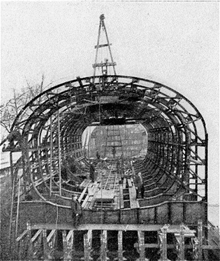 Dans quelques jours, il reposera à sa place définitive, la voûte trouvant à environ un mètre au-dessous du lit de la Seine dont la profondeur moyenne, en cet endroit, atteint 5 mètres. A ce moment, on coulera du béton comprimé dans la chambre de travail et dans les tronçons de cheminées qui traversent les parois du caisson. Des scaphandriers dévisseront les boulons dont l'enlèvement permettra de retirer la partie supérieure des cheminées. Enfin, on jettera des matériaux dans le fleuve pour combler le trou subsistant dans son lit, et le caisson, toujours rempli d'eau, se trouvera isolé sous la Seine, sans communication avec l'air extérieur (fig. 6, 7).