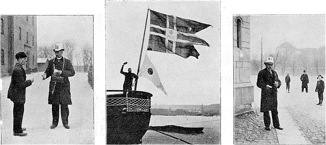 | Distributeur de bulletins monarchistes. | Un bateau du port de Christiania hisse le signal «oui» pour manifester l'opinion de son équipage. | Distributeur de bulletins républicains. |