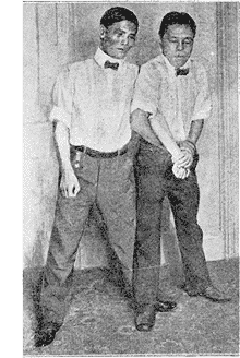 Dans la prise de gorge on saisit l'adversaire par l'intérieur du col de son vêtement et l'on appuie la seconde articulation de chaque index contre la pomme d'Adam. Une pression énergique maintenue plus d'une vingtaine de secondes peut amener la mort d'un homme non entraîné. Mais, quelle que soit sa violence, elle sera immédiatement dénouée si le défenseur, croisant ses mains en avant du corps, projette avec force ses bras de gauche à droite contre les bras de l'assaillant. Elle gênera peu un Japonais habitué à supporter, couché à terre, la pression de trois hommes appuyant de toutes leurs forces sur un lourd bambou placé en travers de sa gorge.