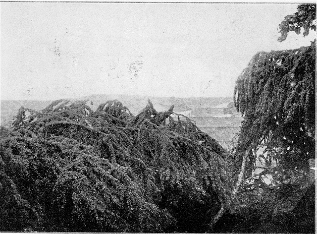 C'est donc avec une extrême surprise qu'on vit, pour la première fois, à la fin du mois de septembre dernier, des nuages de sauterelles s'abattre en Cochinchine. Notre gravure, reproduisant une photographie prise à Saïgon, montre les sauterelles reposées sur les arbres, en telle quantité que les feuilles disparaissent totalement et que les branches plient sous le poids des insectes au point de donner aux arbres l'aspect des variétés dites «pleureuses».