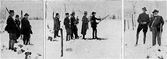 Cette chasse eut lieu, lundi dernier, dans les tirés de Rambouillet. A midi, après un déjeuner au château, un landau, attelé à la daumont de quatre mules harnachées aux couleurs espagnoles--celles-là mêmes que le souverain offrit à M. Loubet lors de son voyage à Madrid--conduisait le président et son hôte, suivis de quelques invités de marque, aux tirés, où le colonel Lamy organisait les battues. Bravant une neige épaisse, d'un effet fort pittoresque dans les bois, mais peu clémente aux chasseurs, et moins encore au malheureux gibier destiné à la rougir de son sang, Alphonse XIII se montra plein d'endurance et d'entrain. Rarement on eut l'occasion d'assister à pareille hécatombe de faisans, de lièvres, de lapins, etc.: 829 pièces au tableau; et la «part du roi» y fut, dit-on, très belle.