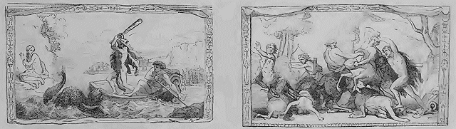 | Hôtel Lambert, voûte de la grande galerie.--Hercule délivrant d'un monstre marin Hésione, fille de Lacomédon, roi de Troie. | Hôtel Lambert, voûte de la grande galerie.--Combat d'Hercule et de Pirithous contre les Centaures, qui ses avaient surpris durant un sacrifice. |