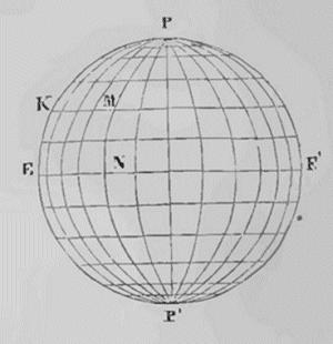 III. Nos lecteurs savent sans doute que l'on entend par pôle les points P et P' situés aux extrémités de l'axe autour duquel tourne notre globe. L'équateur EE' est un cercle détermine par un plan qui coupe la sphère perpendiculairement à la ligne du pôle. Les cercles de longitude ou méridiens PMP', PEP'E, passent tous par l'axe PP' et sont perpendiculaires à l'équateur. Les cercles de latitude, ou parallèles, sont des cercles parallèles à l'équateur, tels que KML, qui vont en diminuant jusqu'aux pôles. Enfin la latitude d'un point quelconque M. est l'arc du méridien MN compris entre ce point et l'équateur, et la longitude du même point est l'arc de l'équateur EN, compris entre le méridien PMNP et un premier méridien PEP' pris d'une manière arbitraire.