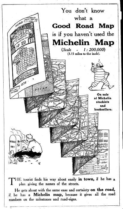 He gets about with the same ease and certainty on the road, if he has a Michelin map, because it gives all the road numbers on the milestones and road-signs.