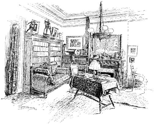 The library,[1] on the ground floor, where callers are usually received, has among the inevitable book-shelves a few photographs of masterpieces. Over the mantelpiece a painting of Weeks’s shows that the sympathies of the owner extend beyond that sphere to which the great public is inclined to confine him.