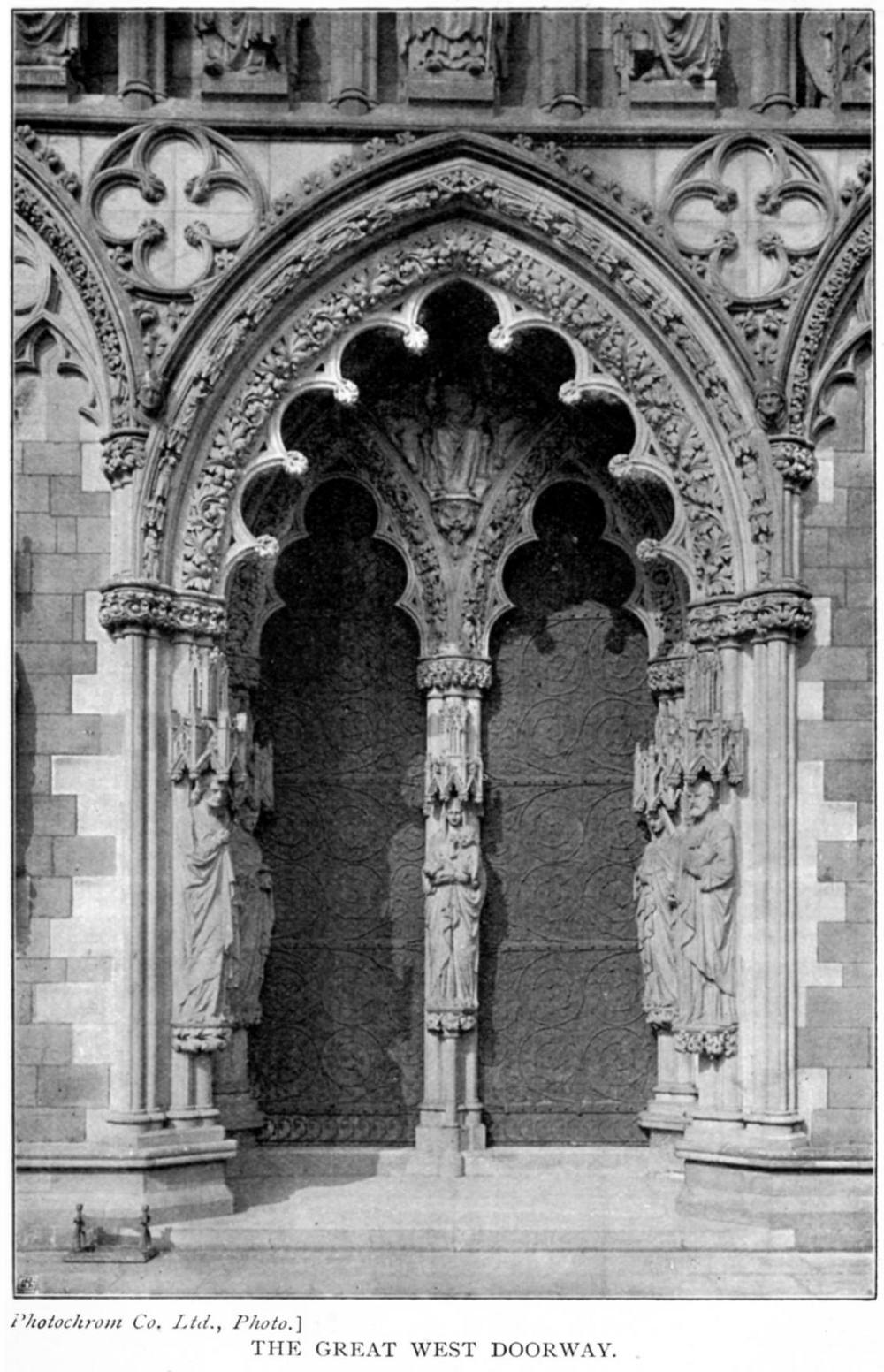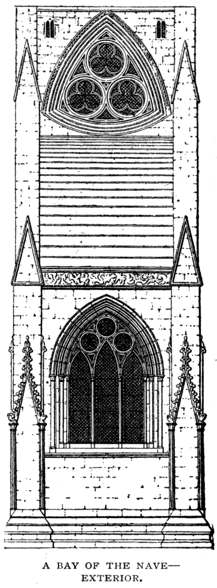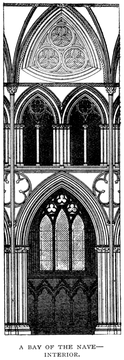 No historical document exists that can apply to the building of the nave; but that must have come next, and have been in progress almost before the north transept could have been finished. The west front was commenced somewhere about the beginning of the last quarter of the thirteenth century, and, including the two towers which form such an important part of it, must have taken a very long time to complete. From the thorough examination made when the recent restorations were in progress, it was decided that these towers were built in three distinct stages—the lowest, which just included the row of kings, being assigned to about 1280; the next stage to 1300; and the upper part, including the belfry windows, to about 1330, while the spires were not finished till some time after.