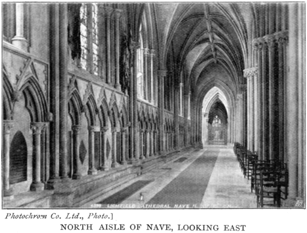 Concerning any old Cathedral the mass of information is very great, and the authorities to be consulted many; and perhaps the almost total absence—as in this case—of a documentary history of the building of the fabric, makes for a larger bulk of pamphlets and of communications to the antiquarian journals. Whether or no theory be wiser than fact, it is certainly more voluminous. Besides the books and papers mentioned in their place, I have especially to express my indebtedness to the work on Lichfield by the Rev. William Beresford, one of the "Diocesan Histories" Series, and to the "Handbook of Lichfield Cathedral" by the late John Hewitt, the well-known antiquarian. I have also to thank Mr R. R. Redmayne of Lichfield for much valuable information, as also Mr C. Harradine, the Principal Verger, whose interest in and knowledge of the Cathedral are well known in Lichfield; and the Photochrom Co. Ltd., Messrs S. B. Bolas & Co., and Mr F. G. M. Beaumont, for the excellent photographs they have allowed me to reproduce.
