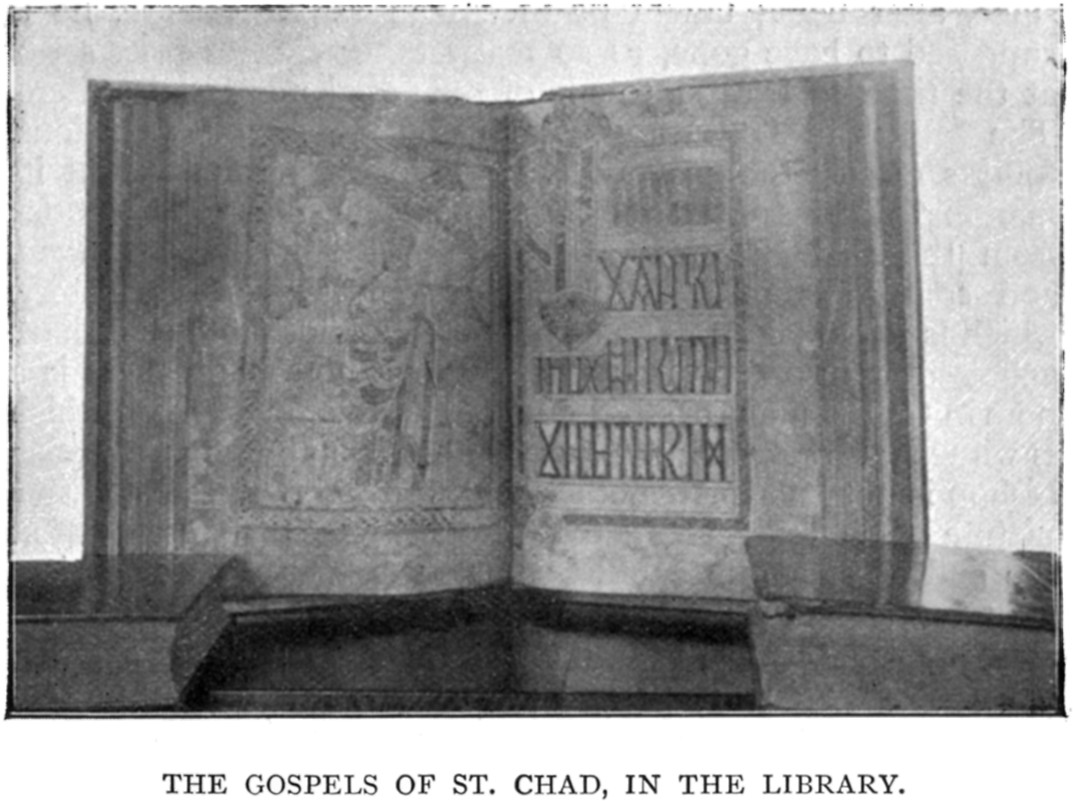 Among the most valuable manuscripts and books in the library are the "Gospels of St. Chad," of which more immediately; a fine folio manuscript, on vellum, of Chaucer's "Canterbury Tales," but without the doubtful Ploughman's Tale; the initial letters, especially those at the commencement of each tale, being richly coloured and gilt; the "Valor Ecclesiasticus of Pope Nicholas IV."—this is an account taken of the value of ecclesiastical property in the time of Edward I., from which the tithe granted to the Pope could be ascertained.