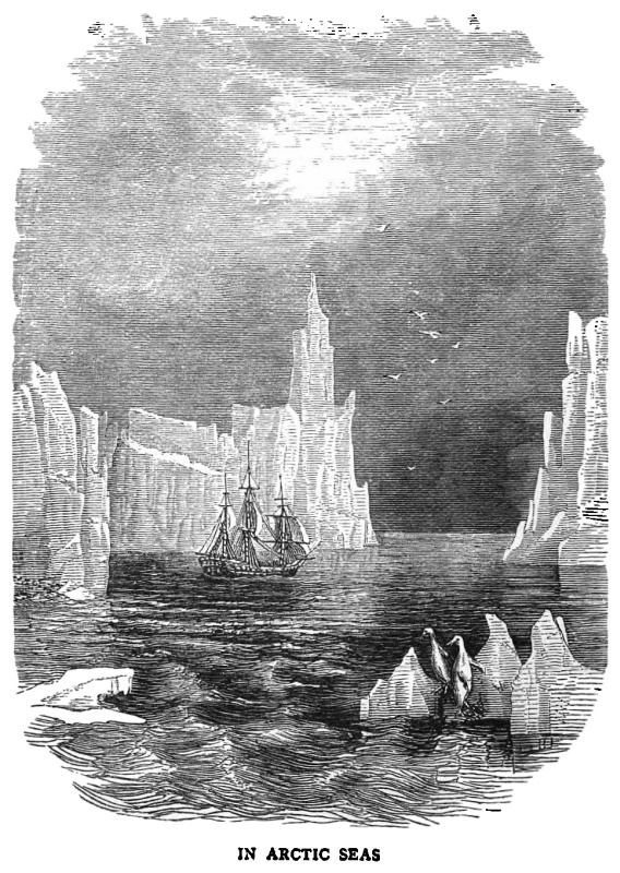 “Yet I, for one, could not help contrasting my present position with what it would have been at home in old England. How different it was here! yet the very difference made it quite charming. Suppose that you had stood on the deck of our brave yacht and looked around; you would have seen that the whole bay was frozen over with thick black ice. No need for boats now, we could skate to the shore. Behind us, seaward, across the month of the bay, stretched a rugged wall of serrated icebergs; on each side of the bay were the ice-clad rocks; shoreward, as you turned your eye, there was first the Innuit village, then the land rose gradually upwards, a snow-clad valley rock-bound, till, in the far distance, behold a vast, towering mountain of ice.