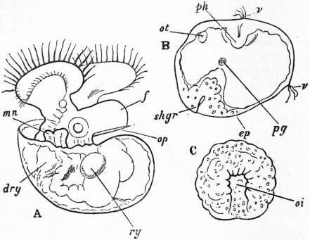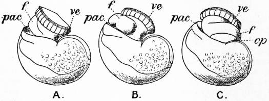 A, Nearly symmetrical larva (veliger). B, A stage 1½ hours later than A. C, A stage 3½ hours later than B. f, Foot. |