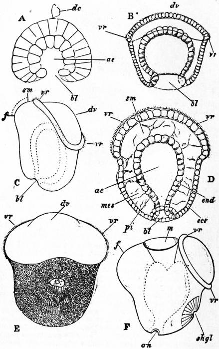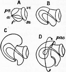 A, Embryo without flexure. B, Embryo with ventral flexure of the intestine. C, Embryo with ventral flexure and exogastric shell. D, Embryo with lateral torsion and an endogastric shell. a, Anus. f, Foot. m, Mouth. pa, Mantle. pac, Pallial cavity. ve, Velum. |