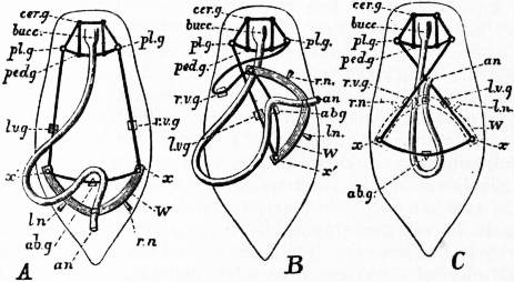A, Unrotated ancestral condition. B, Quarter-rotation. C, Complete semi-rotation (the limit). an, Anus. ln, rn, Primarily left nephridium and primarily right nephridium. lvg, Primarily left (subsequently the sub-intestinal) visceral ganglion. rvg, Primarily right (subsequently the sub-intestinal) visceral ganglion. |
