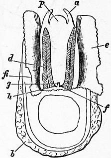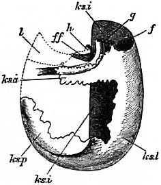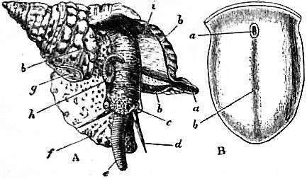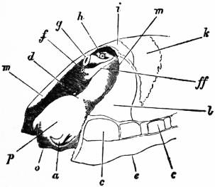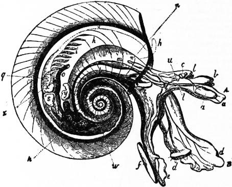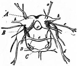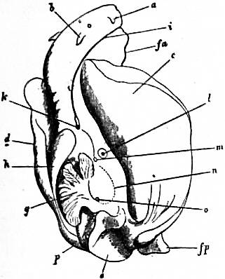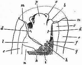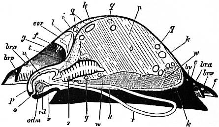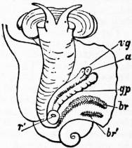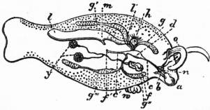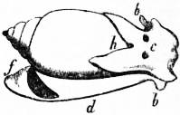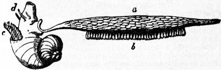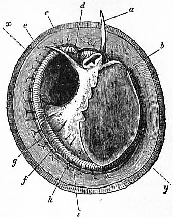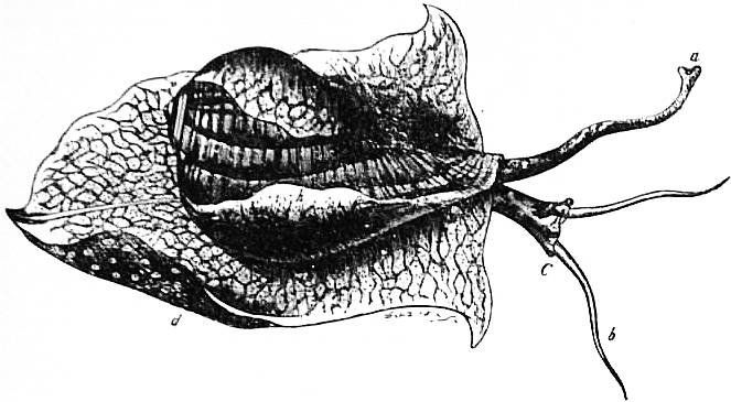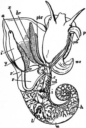 x, y, The median antero-posterior axis. a, Cephalic tentacle. b, Plantar surface of the foot. c, Free edge of the shell. d, The branchial efferent vessel carrying aerated blood to the auricle, and here interrupting the circlet of gill lamellae. |