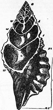 In dextral Gastropods the only structure found on the topographically right side of the rectum is the genital duct. But this is not part of the primitive complex. It is absent in the most primitive and symmetrical forms, such as Haliotis and Pleurotomaria. Originally the gonads opened into the kidneys. In the most primitive existing Gastropods the gonad opens into the right kidney (Patellidae, Trochidae, Fissurellidae). The gonaduct, therefore, is derived from the topographically right kidney. The transformation has been actually shown to take place in the development of Paludina. In a dextral Gastropod the shell is coiled in a right-handed spiral from apex to mouth, and the spiral also projects to the right of the median plane of the animal.