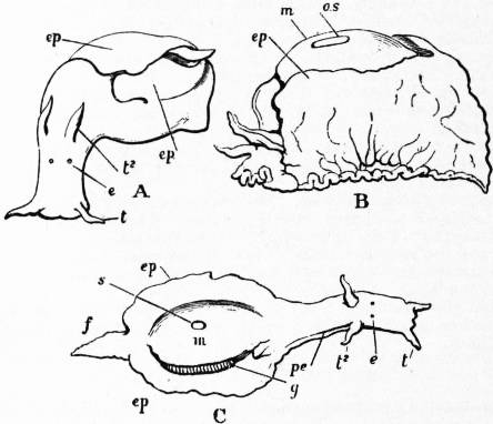 Fig. 1.—Three stages in the development of Trochus, during the process of torsion. (After Robert.) | |