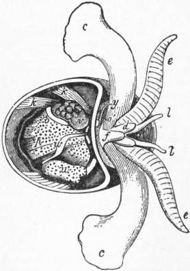 c, Muscular bundles forming the root of the foot, and adherent to the shell. e, Free mantle-skirt. em, Tentaculiferous margin of the same. i, Smaller (left) nephridium. k, Larger (right) nephridium. l, Pericardium. lx, Fibrous septum, behind the pericardium. n, Liver. int, Intestine. ecr, Anterior area of the mantle-skirt over-hanging the head (cephalic hood). |