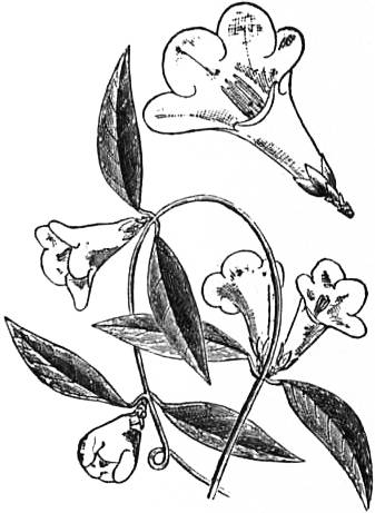 The leaves are in decussating pairs (that is, each pair is in a plane at right angles to the previous or succeeding pair), except in 602 Menyanthes and a few allied aquatic or marsh genera, where they are alternate or radical. Several genera, chiefly American, are saprophytes, forming slender low-growing herbs, containing little or no chlorophyll and with leaves reduced to scales; such are Voyria and Leiphaimos, mainly tropical American. The inflorescence is generally cymose, often dichasial, recalling that of Caryophyllaceae, the lateral branches often becoming monochasial; it is sometimes reduced to a few flowers or one only, as in some gentians. The flowers are hermaphrodite, and regular with parts in 4’s and 5’s, with reduction to 2 in the pistil; in Chlora there are 6 to 8 members in each whorl. The calyx generally forms a tube with teeth or segments which usually overlap in the bud. The corolla shows great variety in form; thus among the British genera it is rotate in Chlora, funnel-shaped in Erythraea, and cylindrical, bell-shaped, funnel-shaped or salver-shaped in Gentiana; the segments are generally twisted to the right in the bud; the throat is often fimbriate or bears scales. The stamens, as many as, and alternating with, the corolla-segments, are inserted at very different heights on the corolla-tube; the filaments are slender, the anthers are usually attached dorsally, are versatile, and dehisce by two longitudinal slits; after escape of the pollen they sometimes become spirally twisted as in Erythraea. Dimorphic flowers are frequent, as in the bog-bean (Menyanthes). There is considerable variation in the size, shape and external markings of the pollen grains, and a division of the order into tribes and subtribes based primarily on pollen characters has been proposed. The form of the honey-secreting developments of the disk at the base of the ovary also shows considerable variety. The superior ovary is generally one-chambered, with two variously developed parietal placentas, which occasionally meet, forming two chambers; the ovules are generally very numerous and anatropous or half-anatropous in form. The style, which varies much in length, is simple, with an undivided or bilobed or bipartite stigma. The fruit is generally a membranous or leathery capsule, splitting septicidally into two valves; the seeds are small and numerous, and contain a small embryo in a copious endosperm.