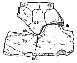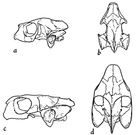 Terrapene ornata differs from T. carolina in having a low, flattened carapace lacking a middorsal keel (carapace highly arched and distinctly keeled in carolina), and in having four claws on the hind foot (three or four in carolina), the claw of the first toe of males being widened, thickened, and turned in (first toe not thus modified in carolina). Terrapene ornata is here considered to be the most specialized member of the genus by virtue of its reduced phalangeal formula, lightened, relatively loosely articulated shell, reduced plastron, and lightly built skull, which completely lacks quadratojugal bones (Fig. 2); most of these specializations seem to be associated with adaptation for terrestrial existence in open habitats.